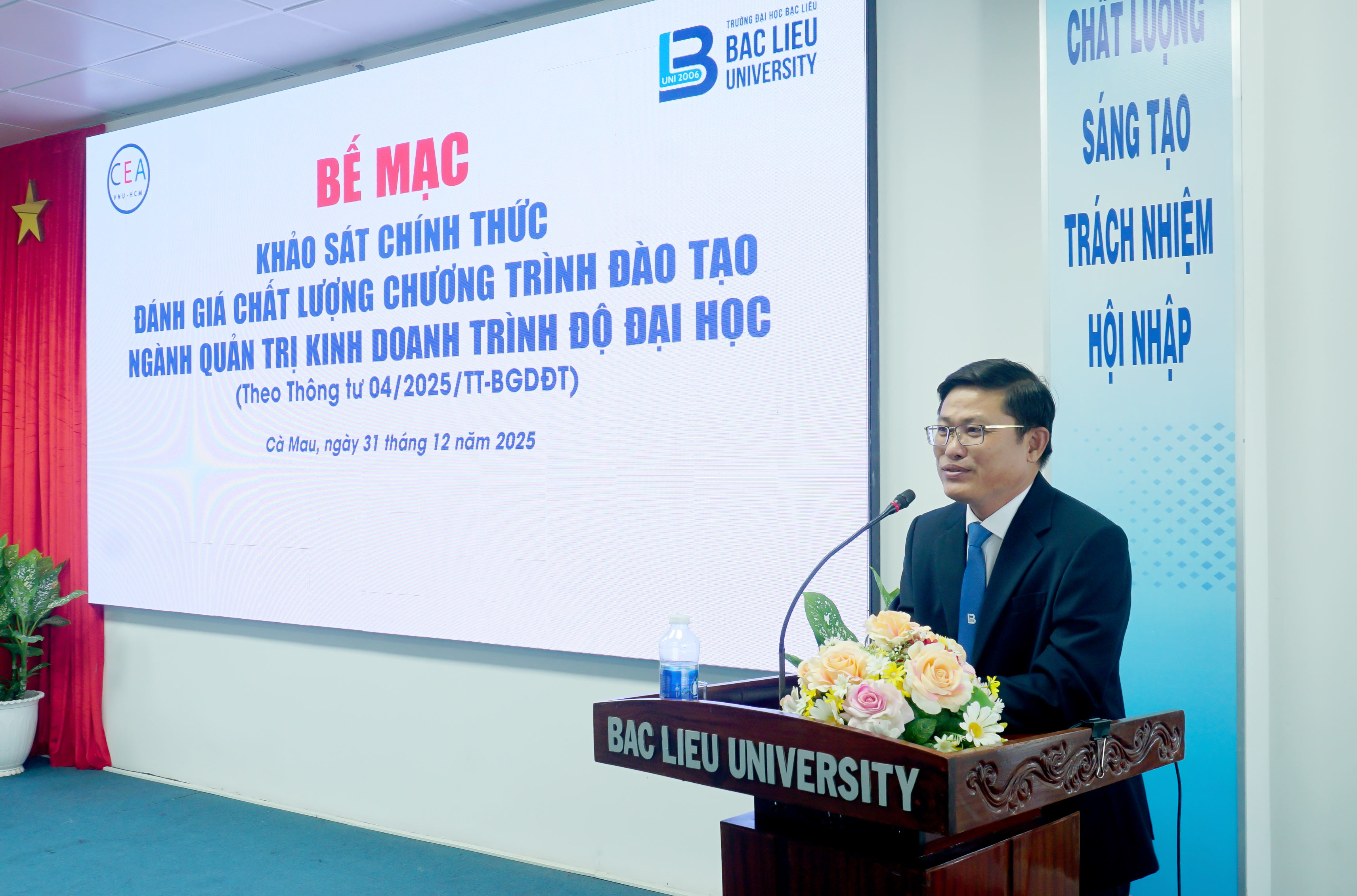 Chiều ngày 31/12/2025 tại hội trường Nhà điều hành, Trường ĐH Bạc Liêu phối hợp với Trung tâm Kiểm định chất lượng giáo dục, ĐHQG - HCM tổ chức bế mạc “Đợt khảo sát chính thức đánh giá chất lượng chương trình đào tạo ngành Quản trị kinh doanh trình độ đại học”