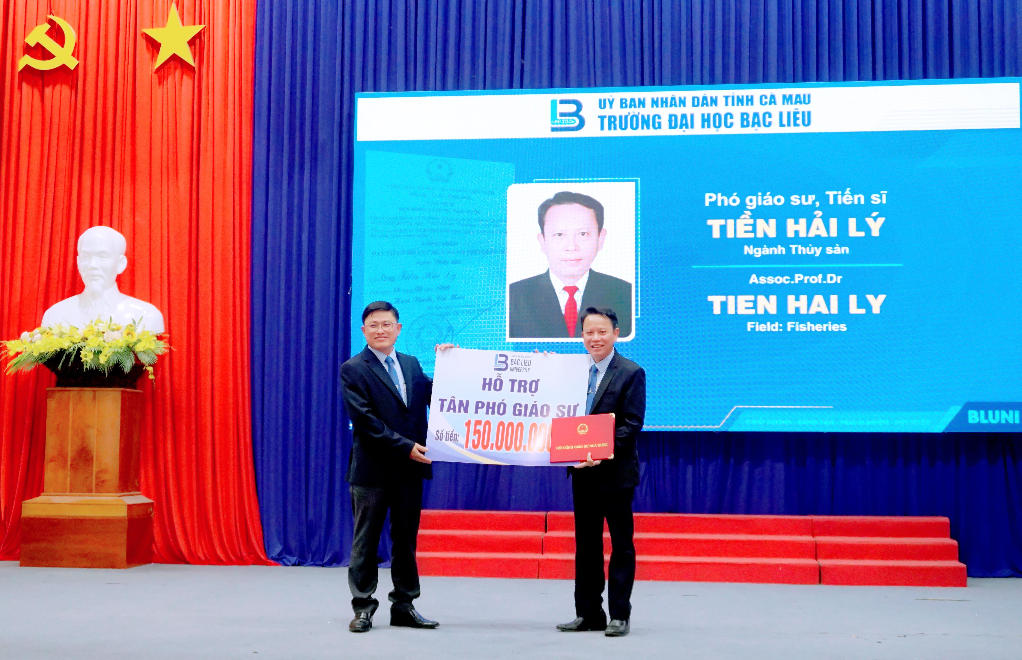 Nhằm ghi nhận thành tích tiêu biểu đối với viên chức đạt chuẩn chức danh Phó Giáo sư. Trường Đại học Bạc Liêu đã trao tặng 150 triệu đồng chúc mừng Tân Phó Giáo sư Tiền Hải Lý