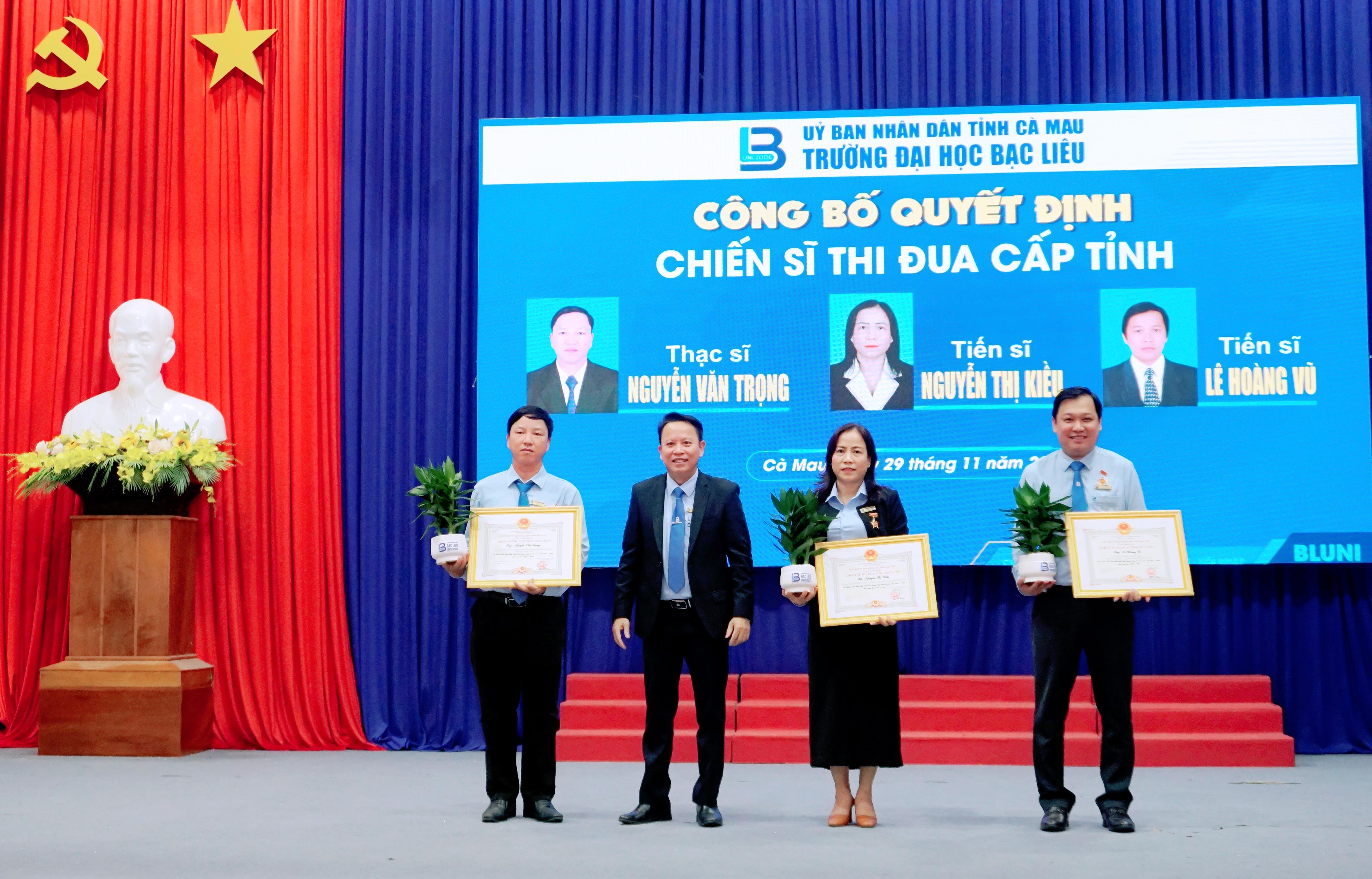 Xin chúc mừng 03 thầy, cô đạt Danh hiệu chiến sĩ thi đua cấp tỉnh: TS Nguyễn Thị Kiều, TS Lê Hoàng Vũ và Thạc sĩ Nguyễn Văn Trọng.