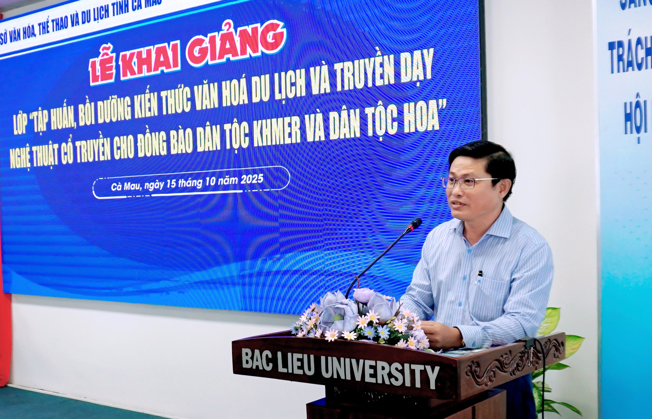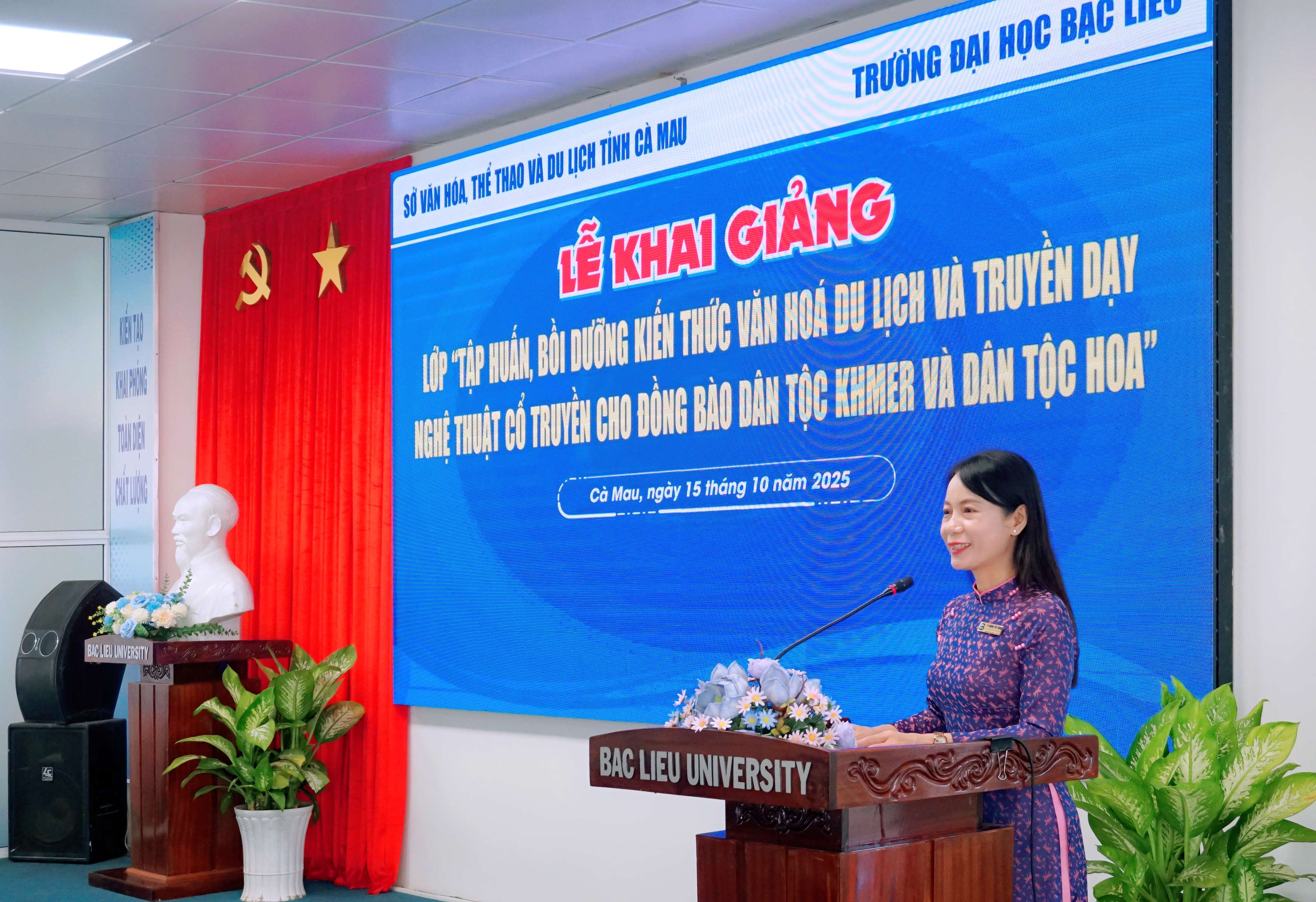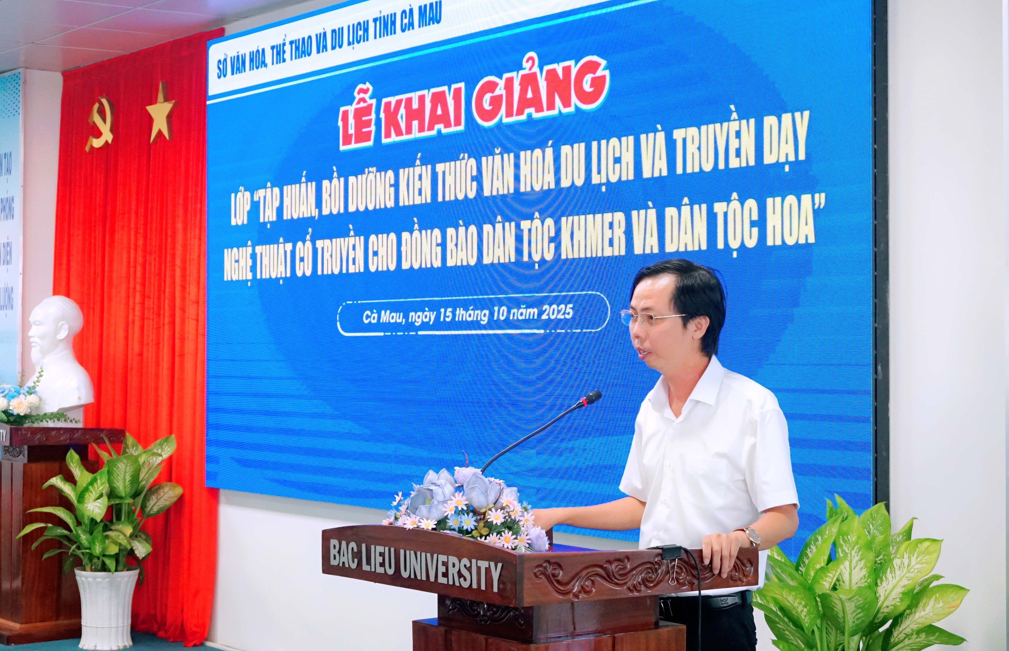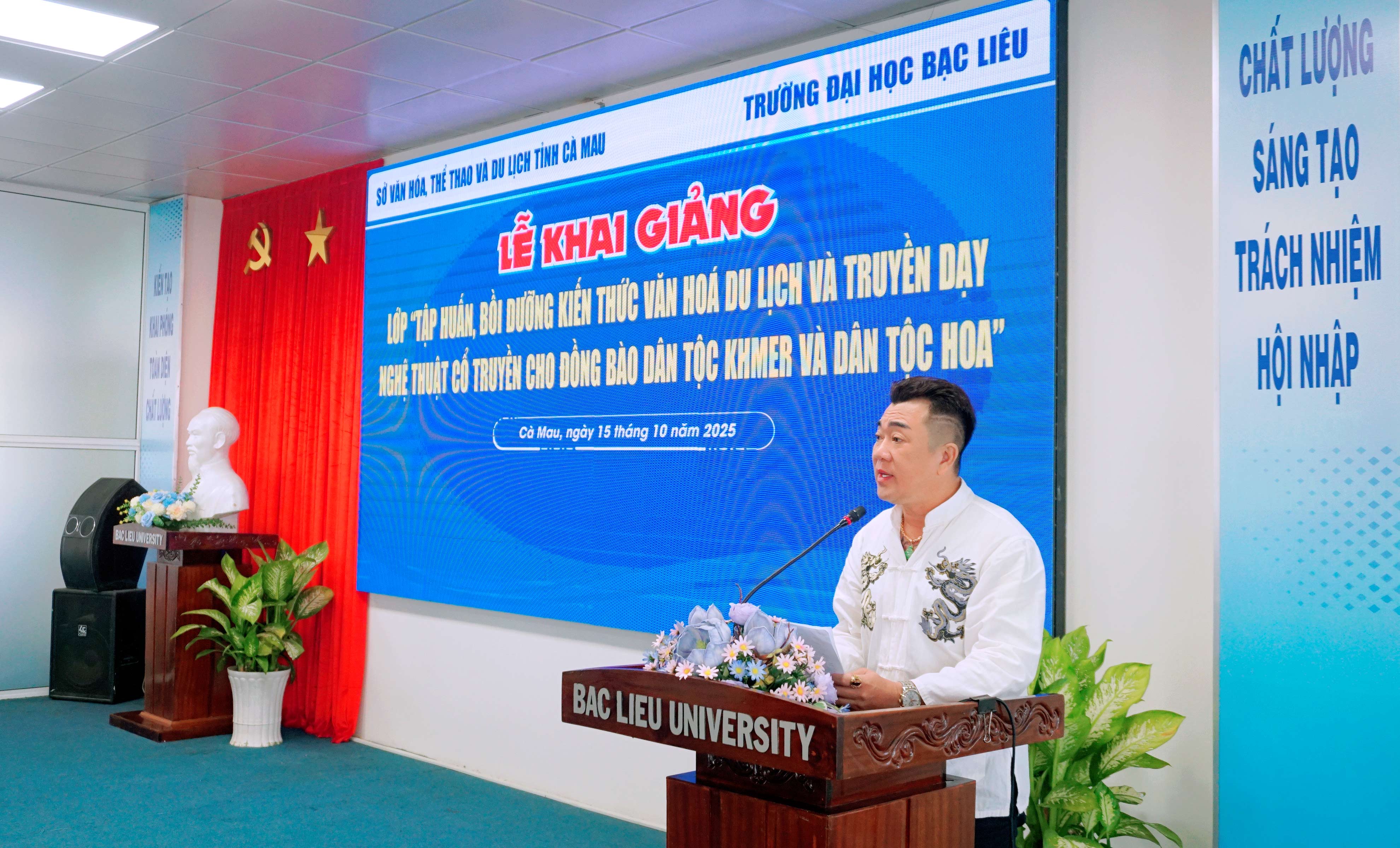 Sáng ngày 15/10/2025, tại Hội trường Trung tâm Thông tin – Thư viện, Trường Đại học Bạc Liêu phối hợp với Sở Văn hóa, Thể thao và Du lịch tỉnh Cà Mau tổ chức khai giảng Lớp tập huấn, bồi dưỡng kiến thức văn hóa du lịch và truyền dạy nghệ thuật cổ truyền cho đồng bào dân tộc Khmer và dân tộc Hoa.