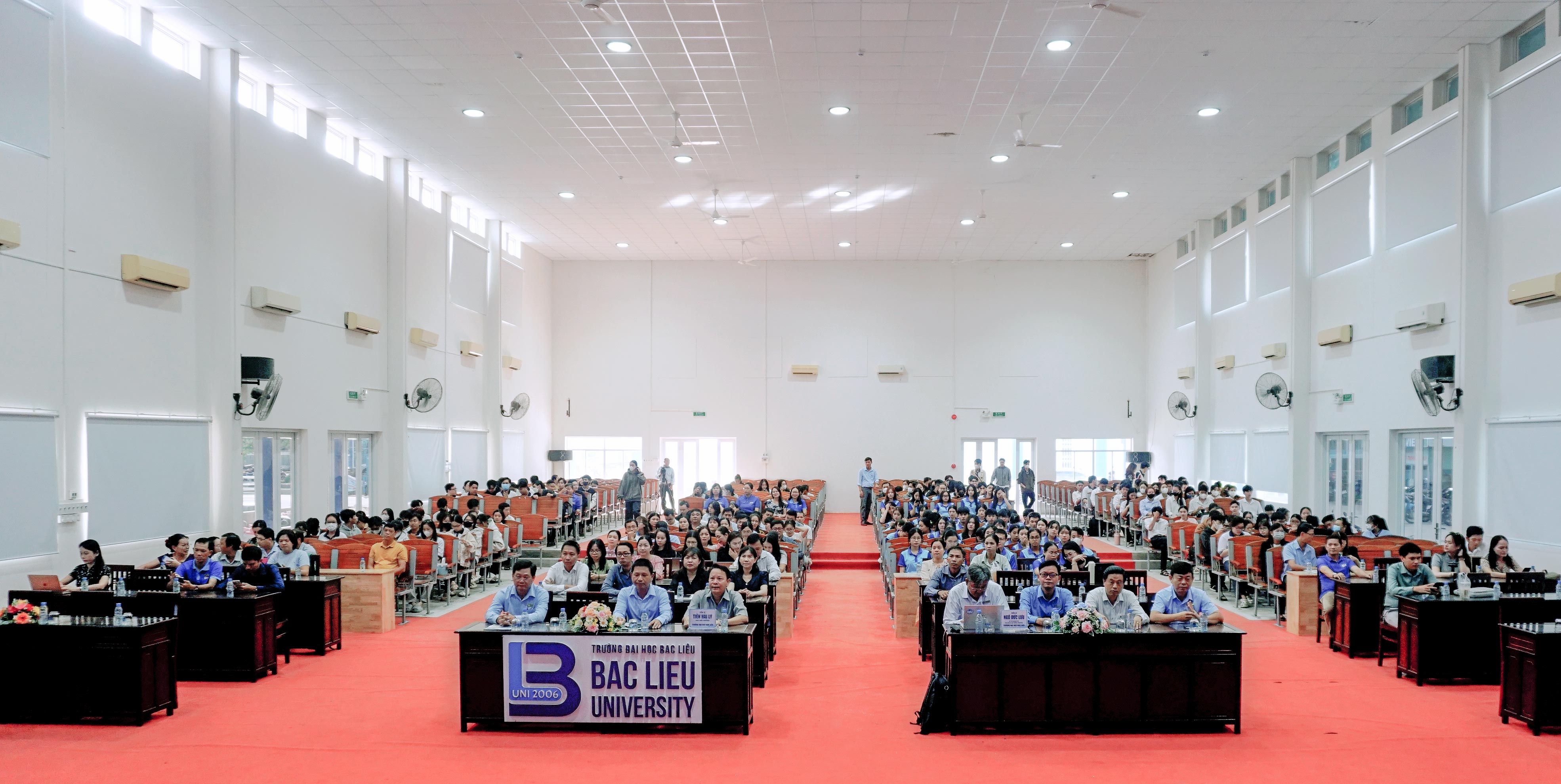 Tham dự chương trình có TS Ngô Đức Lưu – Bí thư Đảng ủy, Chủ tịch hội đồng trường, Phó Chủ tịch Hiệp hội Chuyển đổi số tỉnh Cà Mau; TS Tiền Hải Lý – Phó Bí thư Đảng ủy, Phó Hiệu trưởng; quý thầy cô lãnh đạo các đơn vị trực thuộc Trường, giảng viên, viên chức và hơn 300 sinh viên thuộc Trường Đại học Bạc Liêu.