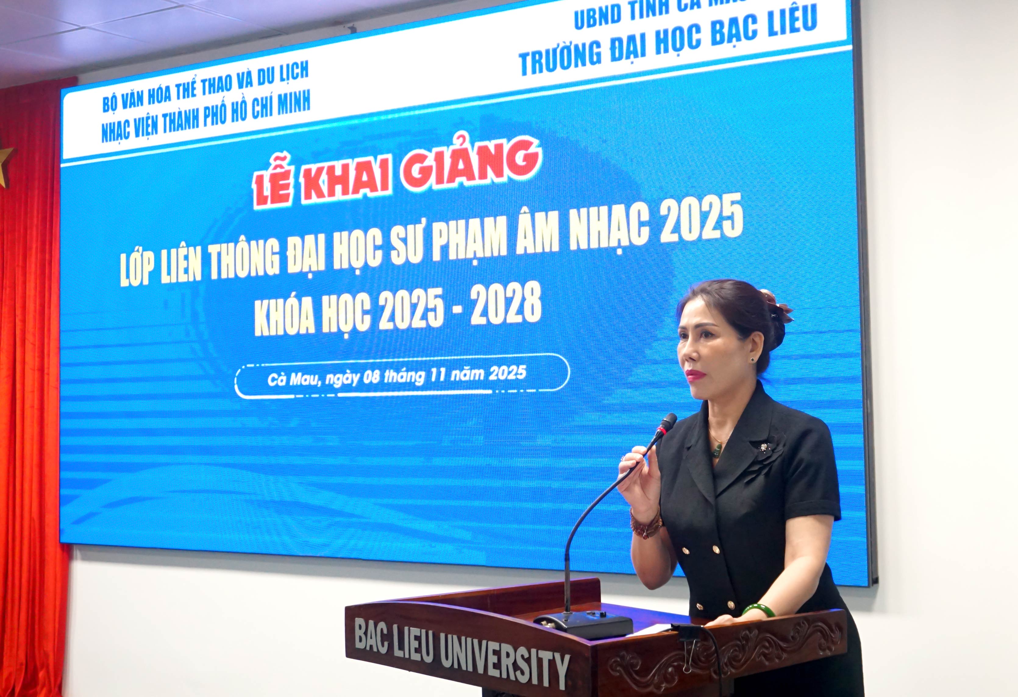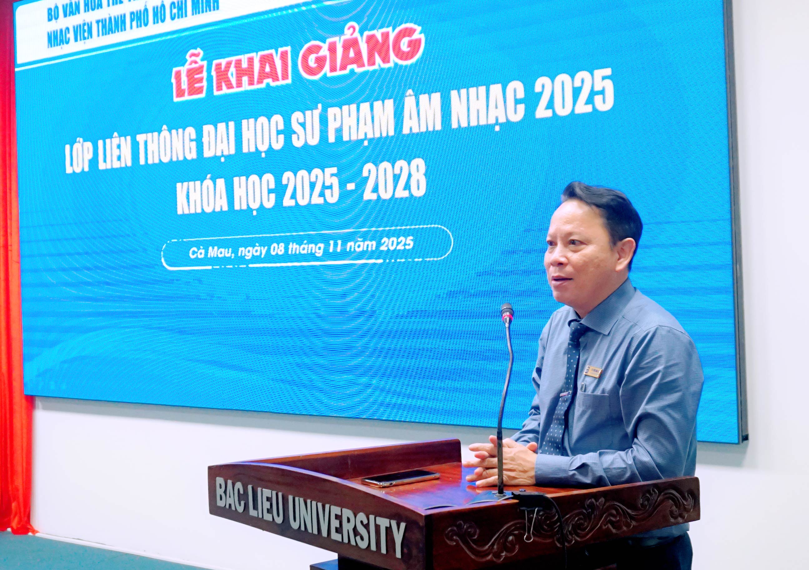Chiều ngày 08/11/2025, Trường Đại học Bạc Liêu phối hợp với Nhạc viện Thành phố Hồ Chí Minh long trọng tổ chức Lễ khai giảng lớp Đào tạo liên thông trình độ đại học ngành Sư phạm Âm nhạc tại Trường Đại học Bạc Liêu.