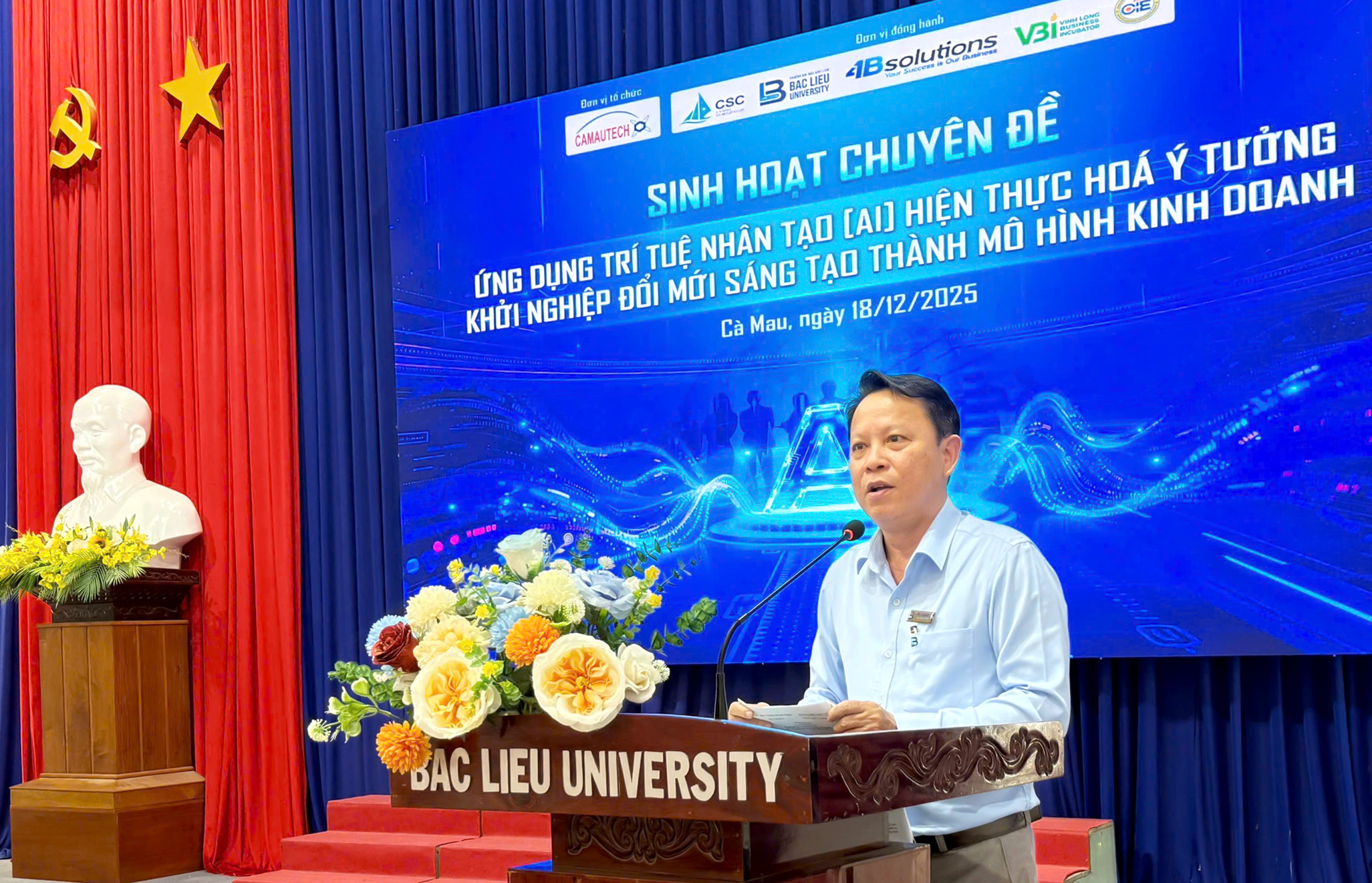 Tại chương trình, PGS. TS Tiền Hải Lý – Phó Hiệu trưởng Trường Đại học Bạc Liêu nhấn mạnh vai trò của trí tuệ nhân tạo (AI) trong thúc đẩy khởi nghiệp, đổi mới sáng tạo, góp phần hiện thực hóa ý tưởng thành mô hình kinh doanh phù hợp với yêu cầu phát triển hiện nay. Đồng thời, hoạt động sinh hoạt chuyên đề là dịp để sinh viên tiếp cận xu hướng công nghệ mới, hình thành tư duy khởi nghiệp gắn với thực tiễn. Trường Đại học Bạc Liêu luôn quan tâm, tạo điều kiện và đồng hành cùng sinh viên trong các hoạt động khởi nghiệp, đổi mới sáng tạo; đồng thời mong muốn tiếp tục tăng cường phối hợp với Sở Khoa học và Công nghệ và các đơn vị liên quan nhằm hỗ trợ hiệu quả các ý tưởng, dự án khởi nghiệp của sinh viên và thanh niên trên địa bàn.