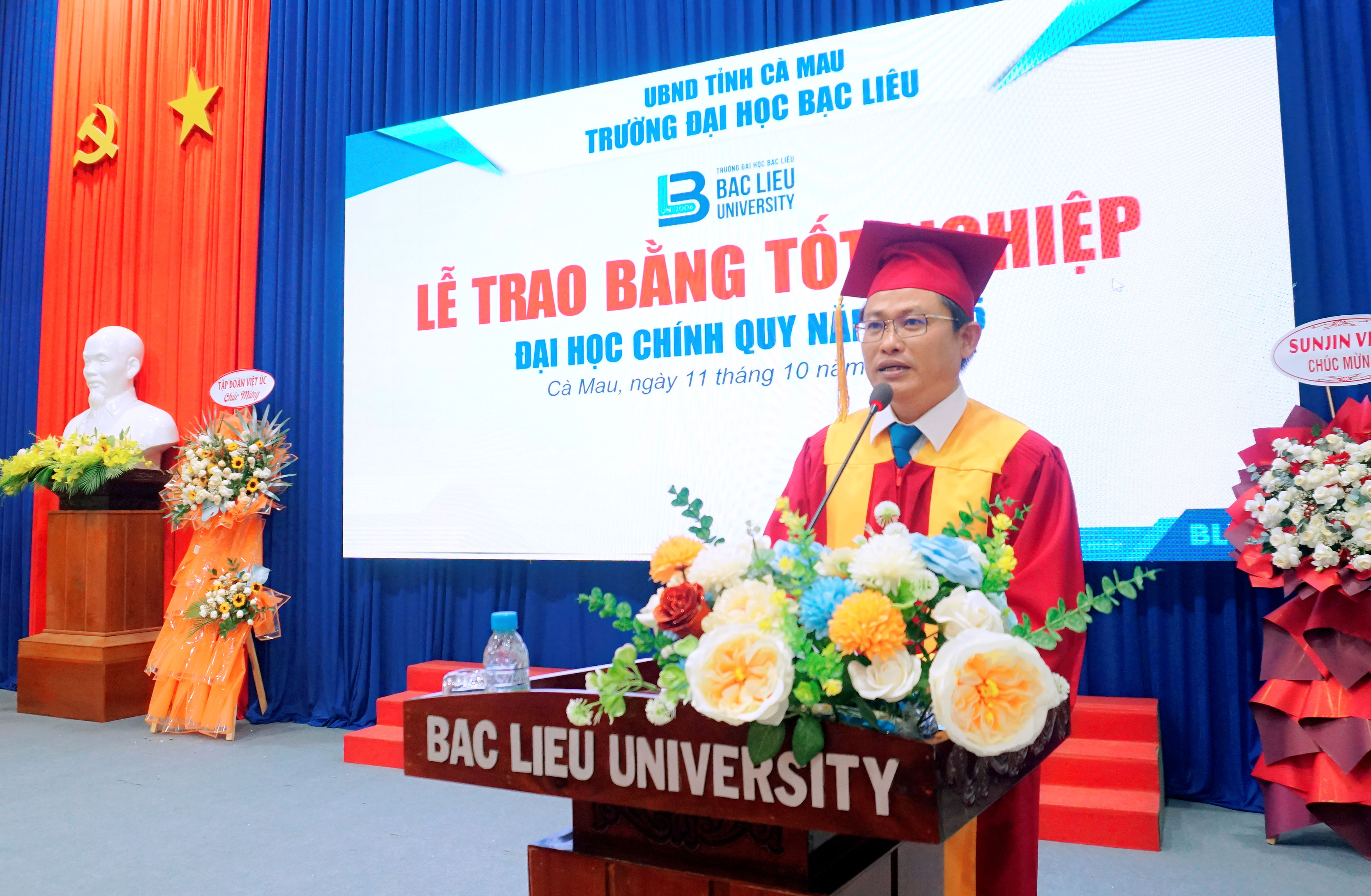 Phát biểu khai mạc buổi lễ, TS Phan Văn Đàn - Hiệu trưởng Trường Đại học Bạc Liêu chúc mừng và nhiệt liệt biểu dương tinh thần trách nhiệm, lỗ lực vượt mọi khó khăn trong học tập và rèn luyện. Tấm bằng cử nhân được nhận hôm nay là sự kết tinh trách nhiệm giữa thầy và trò; giữa nhà trường, gia đình và doanh nghiệp trong suốt thời gian tại giảng đường đại học. Nhân dịp này, Hiệu trưởng trường Đại học Bạc Liêu gửi lời cảm ơn sâu sắc đến gia đình các tân cử nhân, đã dành trọn niềm tin, gửi gắm tương lai của con, em mình cho Nhà trường.