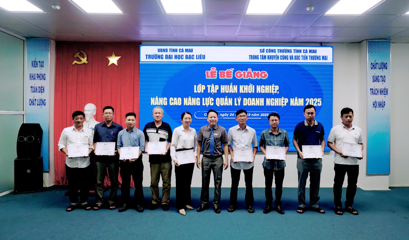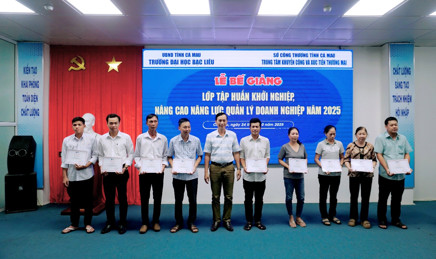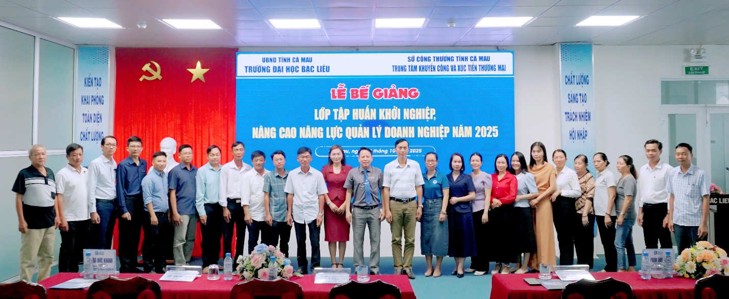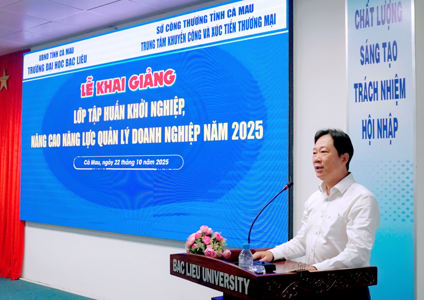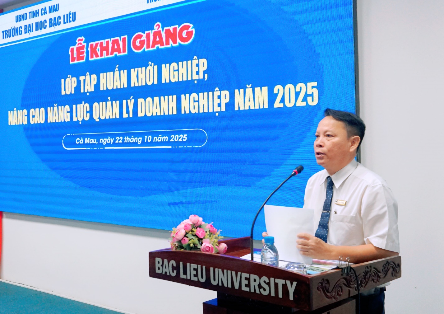 Sáng ngày 22/10/2025 tại Nhà điều hành, Cơ sở 1, Trường Đại học Bạc Liêu đã diễn ra lễ khai giảng lớp tập huấn Khởi nghiệp, nâng cao năng lực quản lý doanh nghiệp năm 2025 do Trường Đại học Bạc Liêu và Trung tâm Khuyến công và Xúc tiến thương mại thuộc Sở Công thương tỉnh Cà Mau phối hợp tổ chức. Tham dự lễ khai mạc có ông Diệp Thanh Triều, Phó Giám đốc Trung tâm Khuyến công và Xúc tiến thương mại – Sở Công thương tỉnh Cà Mau; ông Nguyễn Hữu Nghị, Phó Trưởng ban công tác Nông dân, Hội Nông dân tỉnh Cà Mau; TS. Tiền Hải Lý, Phó Hiệu trưởng Trường Đại học Bạc Liêu; quý thầy, cô lãnh đạo các đơn vị thuộc trường cùng với sự có mặt có 35 Hội viên Hội Nông dân thuộc Hội Nông dân các xã, phường trên địa bàn tỉnh Cà Mau.