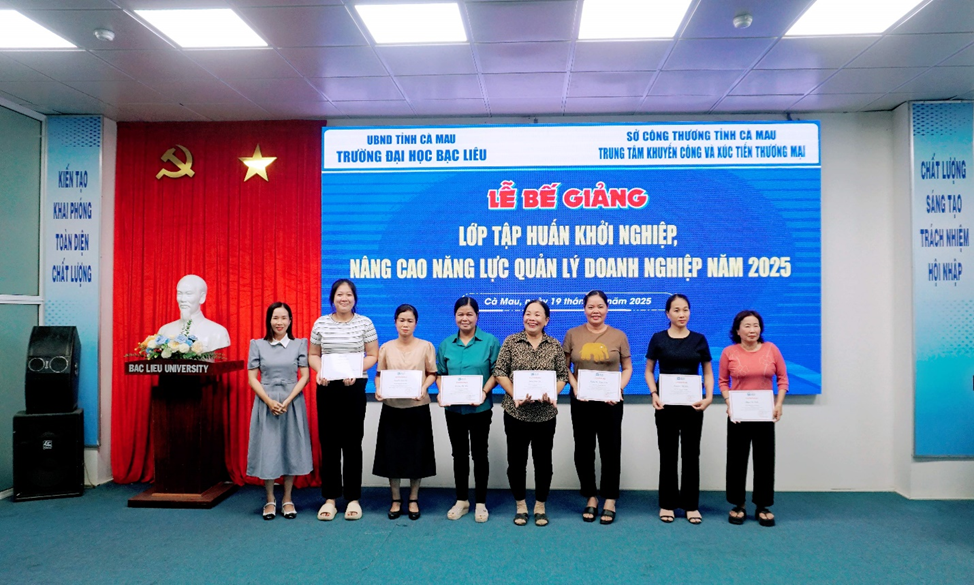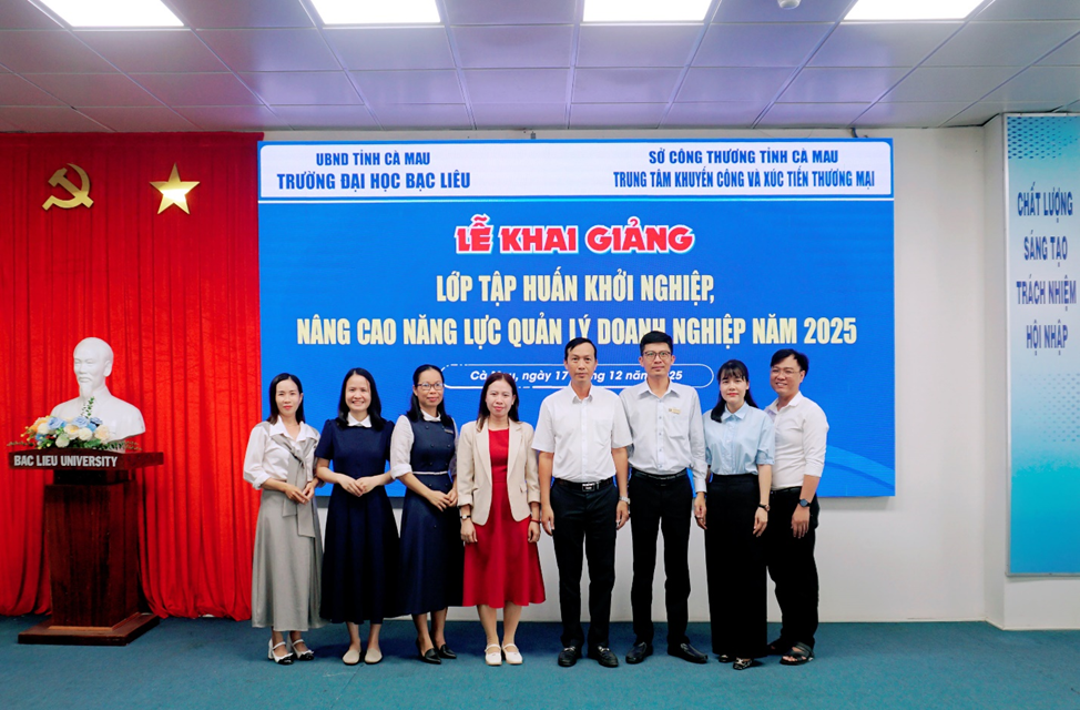 Sáng ngày 17/12/2025 tại Nhà điều hành, Cơ sở 1, Trường Đại học Bạc Liêu đã diễn ra lễ khai giảng lớp tập huấn Khởi nghiệp, nâng cao năng lực quản lý doanh nghiệp năm 2025 do Trường Đại học Bạc Liêu và Trung tâm Khuyến công và Xúc tiến thương mại thuộc Sở Công thương tỉnh Cà Mau phối hợp tổ chức. Tham dự lễ khai mạc có ông Diệp Thanh Triều, Phó Giám đốc Trung tâm Khuyến công và Xúc tiến thương mại; Bà Đỗ Ngọc Hân, Phó Chủ tịch Mặt trận Tổ quốc, Chủ tịch Hội Liên hiệp Phụ nữ xã Hoà Bình; ThS Phạm Ánh Sương, Trưởng phòng Kế hoạch và Tài chính Trường Đại học Bạc Liêu; TS Ngô Đức Khánh, Phó trưởng Phòng Khởi nghiệp, Đổi mới sáng tạo và Tư vấn việc làm Trường Đại học Bạc Liêu; cùng quý thầy, cô tham gia giảng dạy và các học viên đến từ Hội Liên hiệp Phụ nữ xã Hoà Bình – tỉnh Cà Mau tham gia lớp tập huấn.